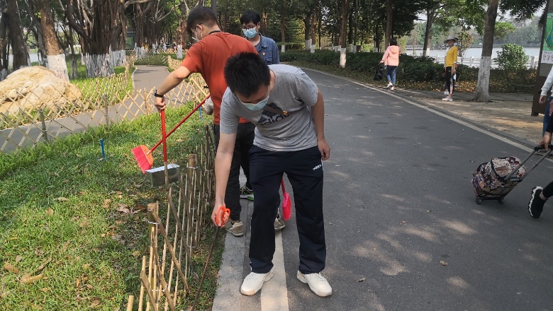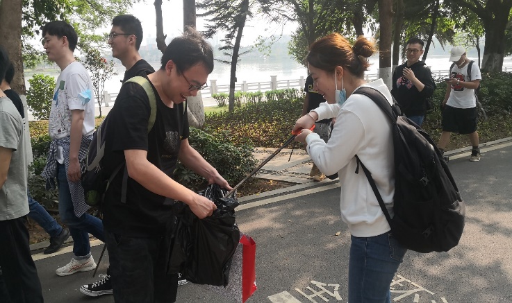 我院研究生志愿者服务队成员们在领取了相关清洁工具后,便绕湖而行,清理处于卫生死角的的垃圾。志愿者们工作热情高涨,以不遗漏一个死角的态度对沿途绿化带进行了地毯式搜索清理。