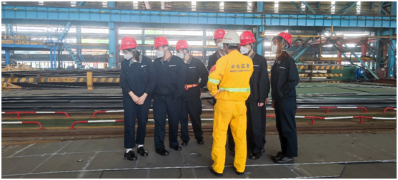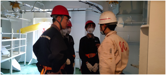 3月6日至3月17日,同学们被分配到文冲厂区造船事业二部各单位进行8天一对一跟学。对接实习的部门有制造部、搭载涂装部、质量部、配套部和技术工法部。在佩戴安全设备的情况下,同学们跟随技术员到加工车间、分段结构内部、船上等进行现场学习。在实习现场,同学们纷纷向师傅们提问表现出了强烈的求知欲,了解了船舶建造流程各岗位负责的主要工作和一些基本建造技术要领。“纸上得来终觉浅”,同学们更为深刻地认识到实践的重要性,只有将书本上的理论知识运用到实际操作,才能发现问题,总结经验,熟练掌握技术有所突破。