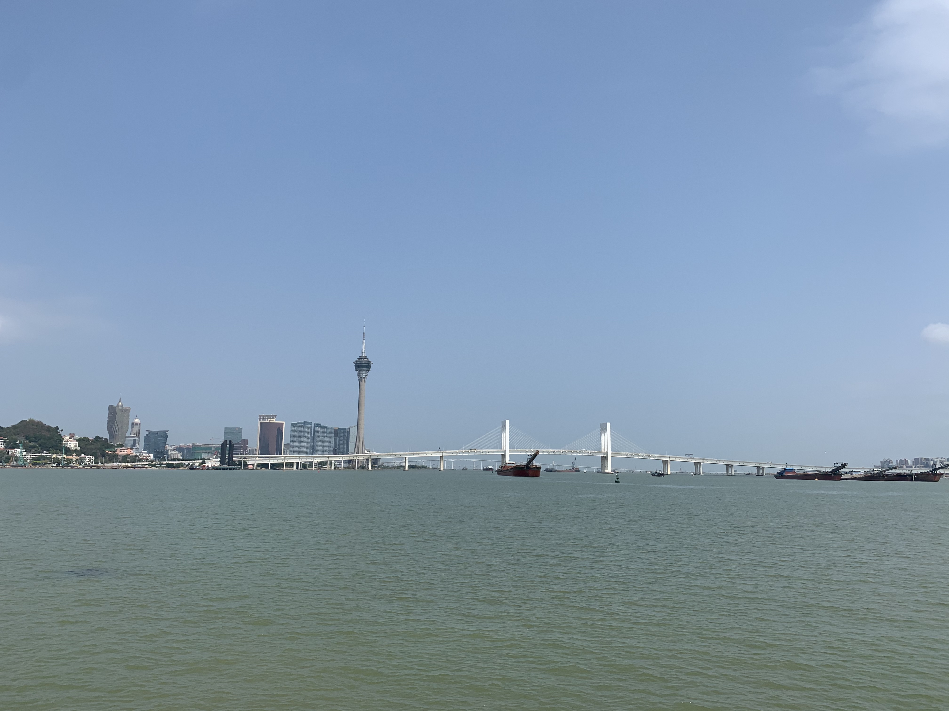 从珠海中心大厦向东南方向远眺澳门,澳门观光塔高耸入云,西湾大桥犹如一条白色缎带将澳门半岛和氹仔岛连接起来。西湾大桥采用抗风性能好、抗扭度大的竖琴双塔斜拉桥,主塔采用“M”型造型。西湾大桥设计为全天候开放的双层通车桥梁,上层桥面通行汽车,下层桥面远期规划双向两线轻轨及汽车道,遇到台风等紧急情况时上层交通关闭,启用下层交通。