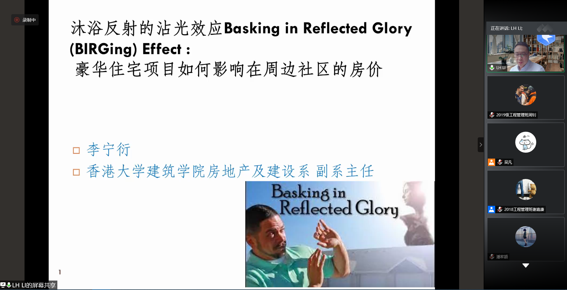 2021年4月9日晚19:00-21:00由华南理工大学土木与交通学院主办、工程管理学社(数学建筑与智能建造学社)承办的《沐浴反射的沾光效应:豪华住宅项目如何影响在周边社区的房价》学术讲座以腾讯会议的方式在线上顺利举行。本次讲座的演讲嘉宾是香港大学房地产及建设系李宁衍副教授,来自土木与交通学院各专业的260多名老师、本科生和研究生参加了此次讲座。