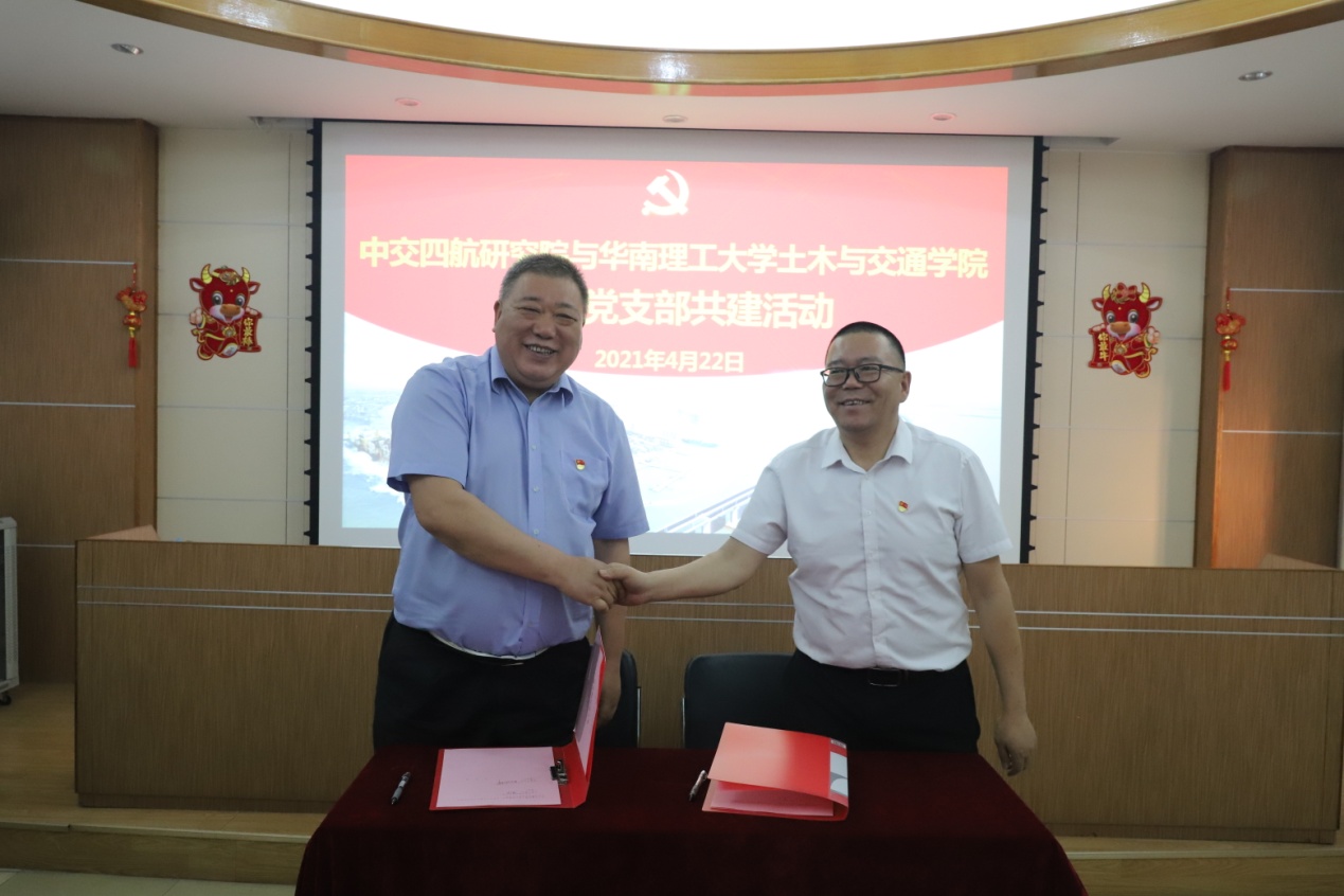 随后,师生党员们来到中交四航工程研究院结构所,参加党史学习教育暨校企党支部共建签约仪式。中交四航工程研究院党委副书记任德杨、土木与交通学院党委副书记王磊分别对企业和学院的党建工作情况做了简介。中交四航工程研究院结构所党支部书记桑登峰对校企党支部共建方案做了介绍。中交四航工程研究院结构所党支部副书记李治学对执行党支部共建方案表示决心,土木与交通学院研究生2020级第三党支部的学生代表叶凌波则对本次参观发表了学习感言。