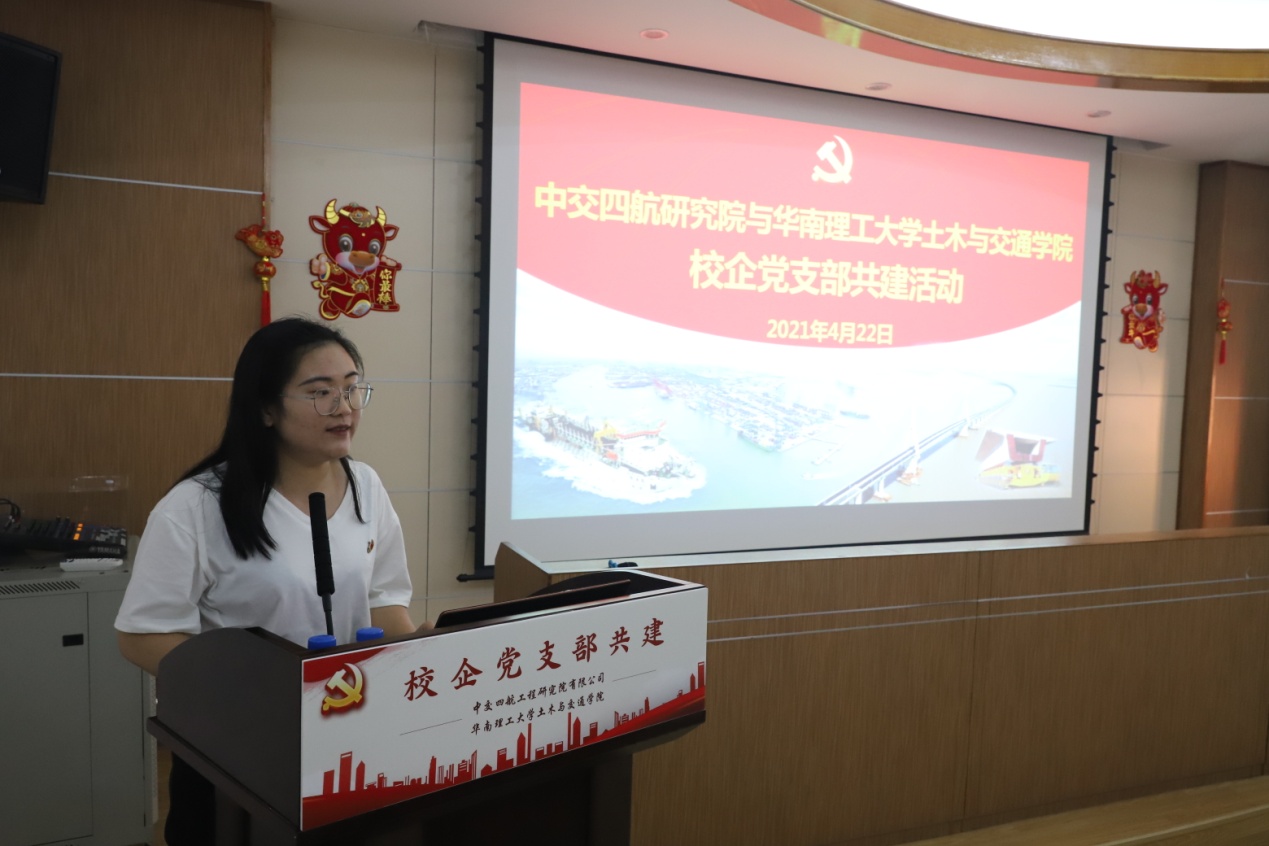 4月22日下午,华南理工大学土木与交通学院与中交四航研究院开展党史学习教育暨校企党支部共建活动,土木与交通学院党委书记郑存辉、学院党委副书记王磊、学校党史学习教育第四指导组副组长、马克思主义学院副教授张冬利、土木与交通学院辅导员苏图及研究生2020级第三党支部成员,中交四航工程研究院党委书记董志良、研究院党委副书记任德杨、研究院党委组织部副部长孙雷、研究院结构所党支部书记桑登峰、研究院结构所党支部副书记李治学及结构所支部成员共计40余人参加了活动。