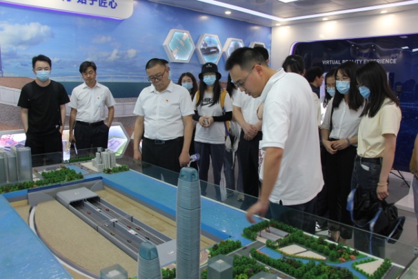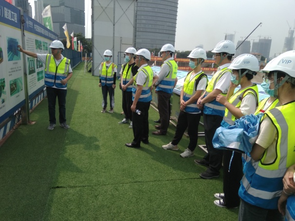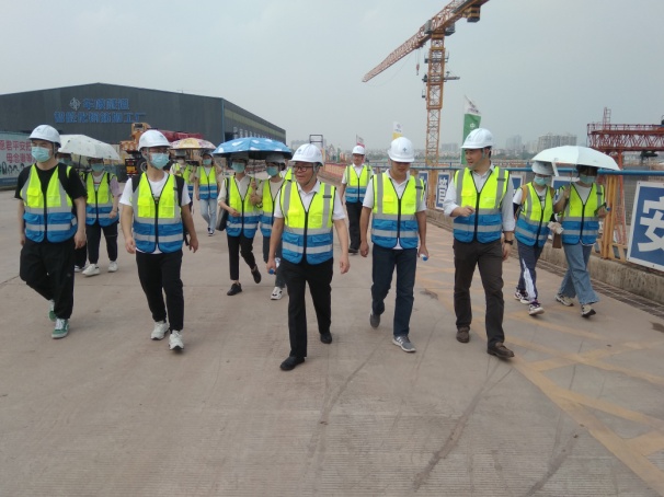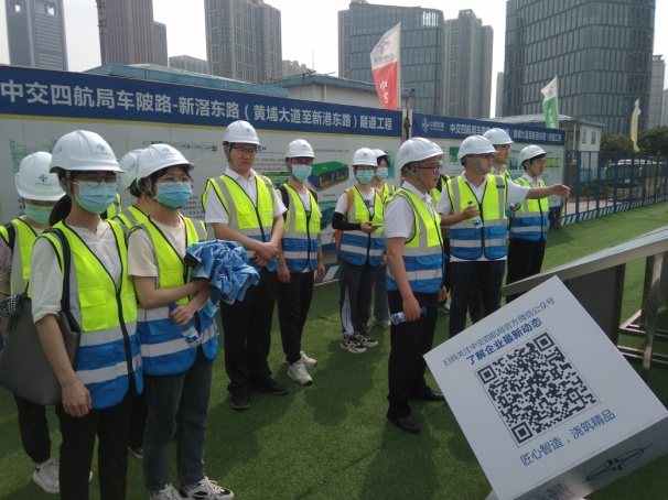 我院师生首先来到中交四航工程研究院在建的车陂路-新滘东路隧道工程现场参观学习。据项目负责人介绍,该隧道是连接广州国际金融城与琶洲大湾区琶洲数字经济创新试验区的战略发展通道,是连通黄埔、天河、海珠、番禺交通动脉的重要环节,隧道项目全长约2070米,道路规划宽度60m,隧道段为双向6车道,设计车速60km/h。其中沉管隧道段采用4节沉管,横截面设计宽度30.40米,高度8.70米,截面面积达264.48平方米。工程采用了多项先进的施工技术,项目全体人员发扬艰苦奋斗精神,2017年底开始施工以来,车陂隧道项目工程进度完成率约30%,首节过江的沉管初定下个月浇筑,整个工程预计2022年年中建成通车。师生党员们在现场认真学习了项目施工的技术介绍,观摩了项目的施工过程,强烈感受到了我国基建行业的“中国力量”和“中国速度”。