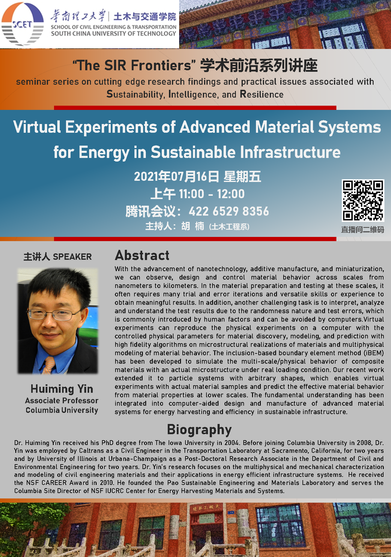 Huiming Yin教授于1995年在中国河海大学获得学士学位,1998 年在北京大学获得硕士学位,并于2004 年在美国爱荷华大学获得博士学位。随后,他在加州交通运输局萨克拉门托交通实验室任工程师两年,并在美国伊利诺伊大学厄巴纳-香槟分校UIUC土木与环境工程系从事博士后研究两年。Yin老师于2008 年加入美国哥伦比亚大学土木工程与工程力学系, 研究方向是土木工程材料的多物理及力学表征和建模及其在节能基础设施系统中的应用。他于 2010 年获得 NSF CAREER 奖。他创立了the Pao Sustainable Engineering and Materials Laboratory,并担任 NSF IUCRC 能量收集材料和系统中心的哥伦比亚站点主任。更多详情请参阅:https://www.engineering.columbia.edu/faculty/huiming-yin