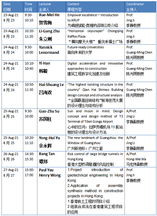华南理工大学土木工程专业学生的境内外工程实践采用线上讲座方式,特别邀请到奥雅纳咨询公司(ARUP)、WSP和Jacobs/Halcrow China三家国际公司进行线上讲座,内容涵盖大型公共建筑和基础设施的设计与施工、建筑工程数字化及土木工程专业的职业规划等。