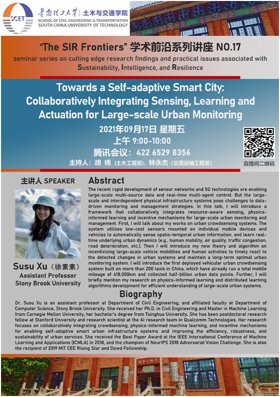 徐素素博士是石溪大学土木工程系助理教授,还是计算机科学系兼任教员。她本科毕业于清华大学获得学士学位,随后在美国卡内基梅隆大学获得机器学习硕士学位和土木工程博士学位。她曾任美国斯坦福大学博士后研究员和美国Qualcomm技术公司人工智能研究团队的研究科学家。她的研究重点是协同整合群体感知、物理信息机器学习和激励机制,以实现自适应智能城市基础设施系统并提高城市服务的效率、稳健性和可持续性。她在2018年的IEEE机器学习与应用国际大会(ICMLA)上获得了最佳论文奖,并获得了NeurIPS 2018对抗性视觉挑战赛的冠军。她曾入选2019年麻省理工学院CEE明日之星和多德奖学金等荣誉。