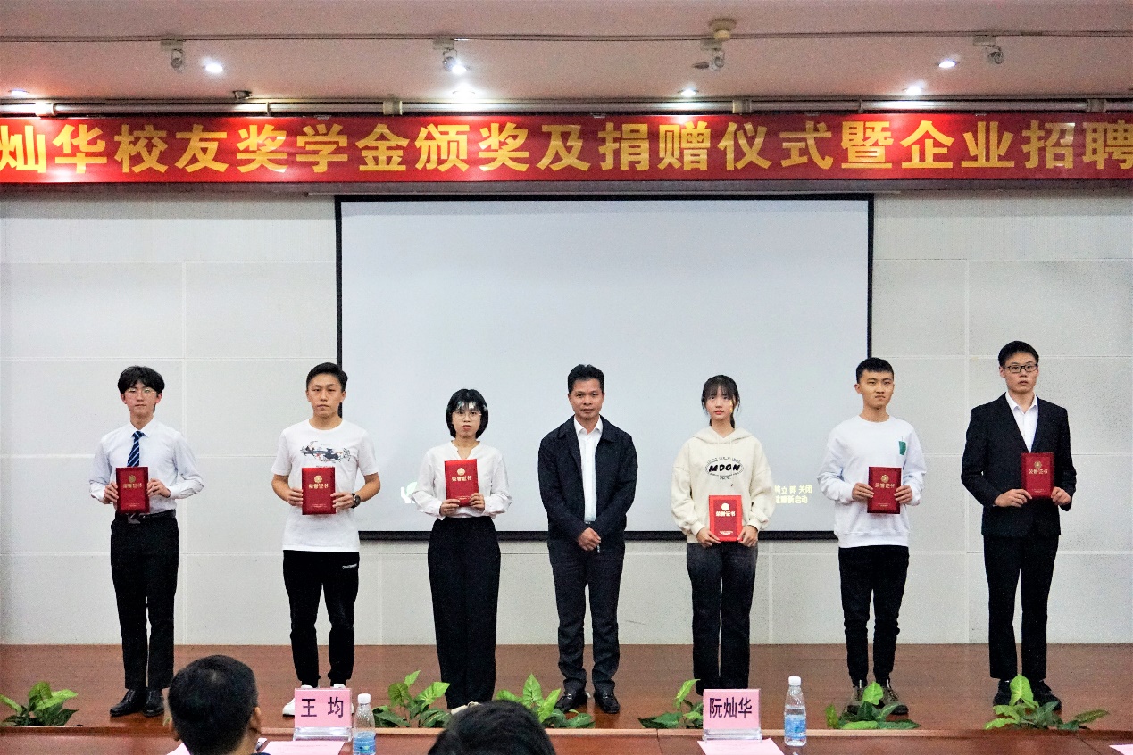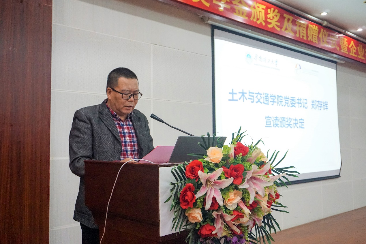 颁奖仪式上,土木与交通学院党委书记郑存辉宣读了颁奖决定,阮灿华校友为获得2020-2021年学年度“阮灿华校友奖学金”的学生代表颁发荣誉证书,获奖学生代表石子洋进行了发言。