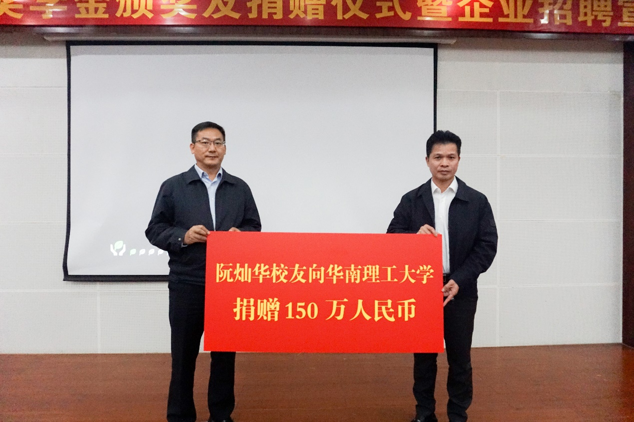 捐赠仪式上,王均常委代表学校接受阮灿华校友捐赠的150万元人民币支票,并向其授予捐赠证书和纪念牌。这是阮灿华校友继捐资设立“清远籍学子奖助学金”、“阮灿华校友奖学金”,合作捐资设立“90力学同学会奖助学金”之后的再次捐赠,用于土木与交通学院设立阮灿华校友奖学金,旨在奖励和资助品德优良、学习成绩优秀、创新实践和学生工作表现突出的学生。