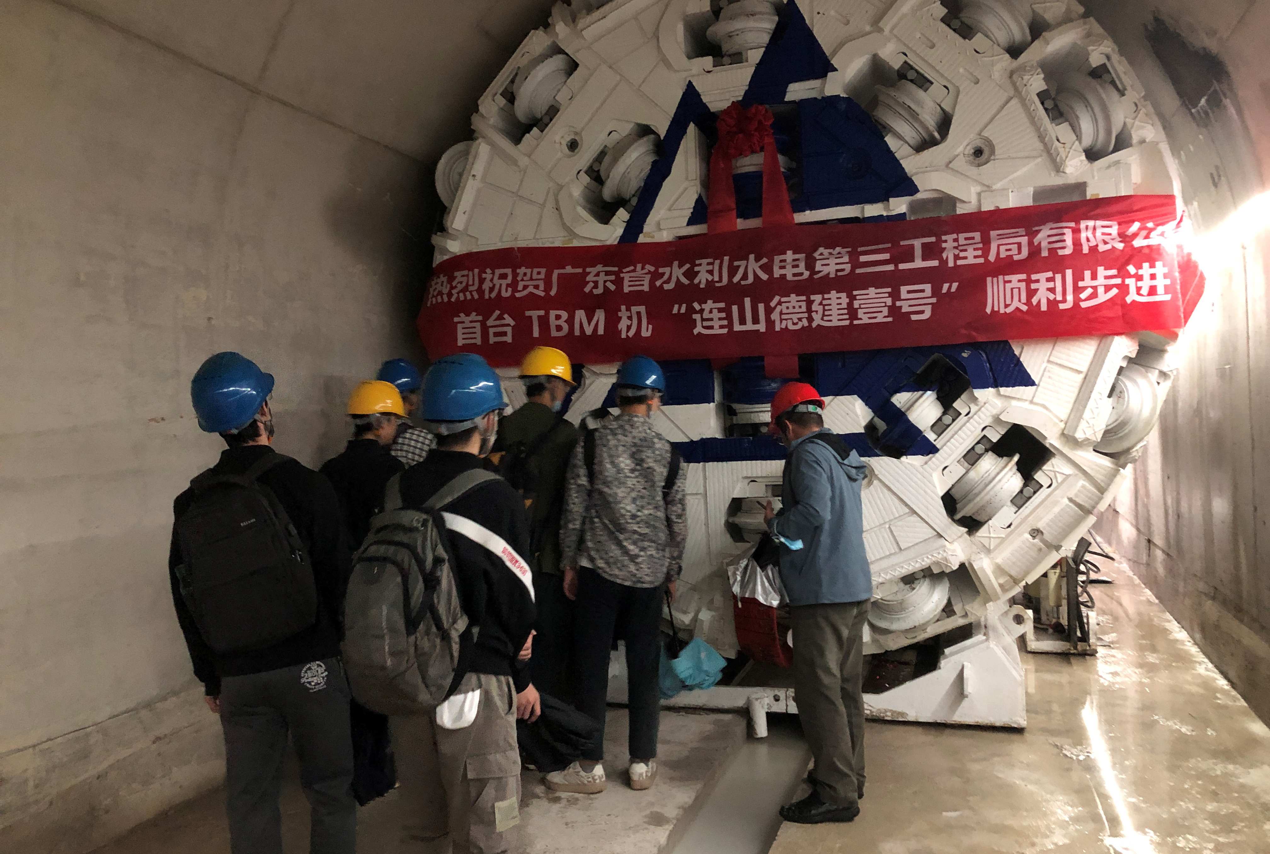 10月21日,我院2018级水利水电工程班全体学生在王常红和周浩老师的带领下,来到连山县德建水库供水工程项目现场参观实习。德建水库供水工程由广东省水利水电第三工程局有限公司总承包施工建设,以德建水库为取水源,通过现状供水管道、新建输水管道及输水隧洞,将水供给连山县吉田镇、预留福堂镇和永和镇供水支线分水点,并对吉田镇石龙嘴水厂进行扩建。德建水库供水工程是解决连山县5.68万城镇居民供水需求的民生工程,其中埋管段4 km,隧洞段7.5 km,工程总投资约3.9亿元。本次实习重点参观了隧洞段的TBM施工现场。