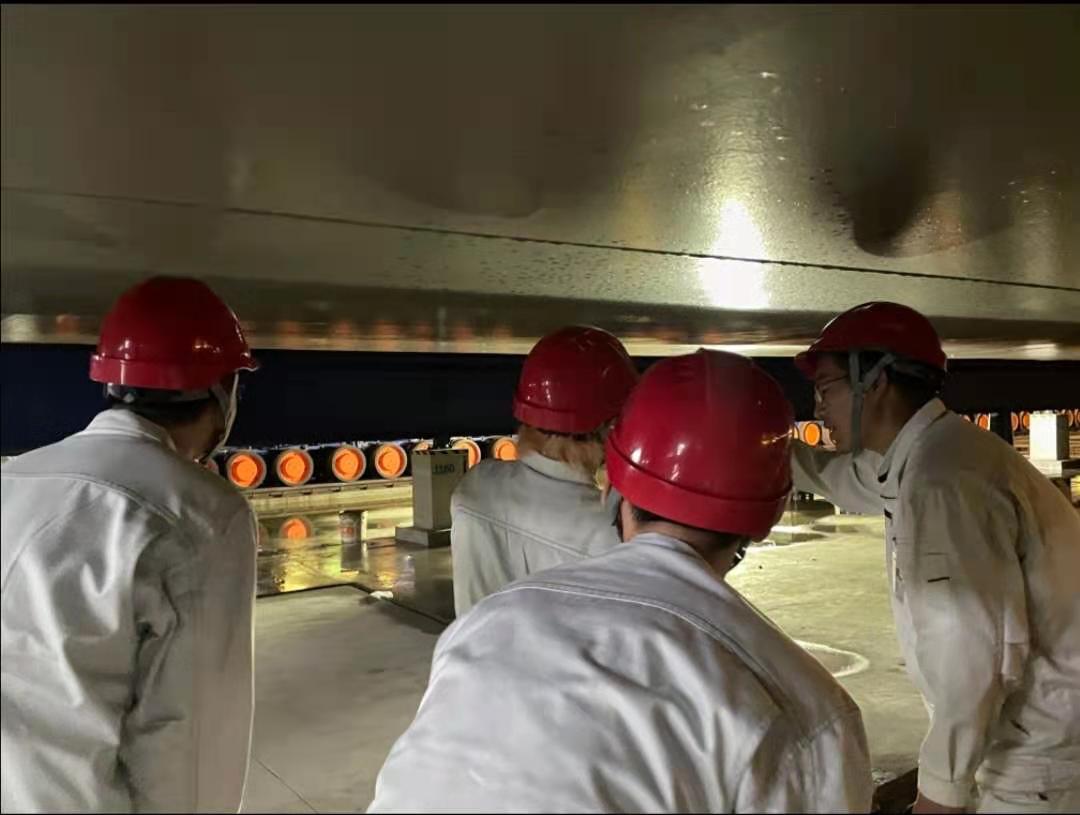沉管制作好后从卸驳码头转移到卸驳区,等待前一节沉管浇筑好转移后,通过两百台总共可承载能力为八万吨的台车承载纵移至浇筑区进行浇筑,在混凝土浇筑完成后再纵移至浅坞区。同学们跟随工程部张清副部长到沉管底下近距离观察台车运作,顶上是重达上万吨的沉管,也是一种别样的体验,突出体现了公司自主研发的台车承载能力。从港珠澳大桥的顶推式到深中通道的台车纵移,纵移过程从数十天缩短至四小时,让同学们认识到在一个工程中的创新提升效率的重要性,这不仅仅只是学习土木工程相关专业知识,还需要跨学科的知识,从不同的思考角度出发完善专用设备功能,开发出多功能的专用设备,才能更快更好地完成一个工程。