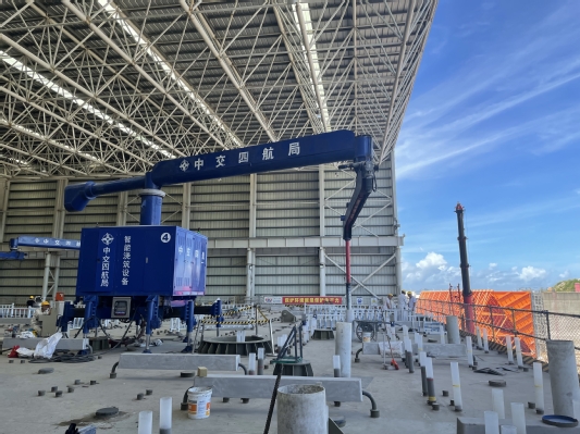 据部长们介绍,智能浇筑机由校企共同研发,研发周期长达两年,研发经费高达两千万。其核心技术是利用光学传感器根据液面高度自动提升末端浆管,拖泵流量控制系统可实现自动调速。整个过程以数字化的形式展示,下料高度、浇筑速度等施工参数实时更新并显示在一旁的设备屏幕上,以便精细化地控制每个仓格的浇筑过程,提高施工效率并降低施工风险。