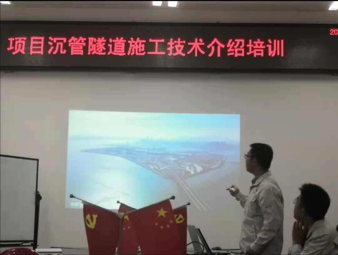 在项目部的安排下,同学们第一天正式实习开展了“实习生进场安全教育培训”;此后在公司新员工到来后,与新员工一起再次进行培训,学习施工技术、设备管理、施工管理等。同学们参加了各种会议,例如E14管节浇筑施工技术交底会议、E12管节验收报告会等。