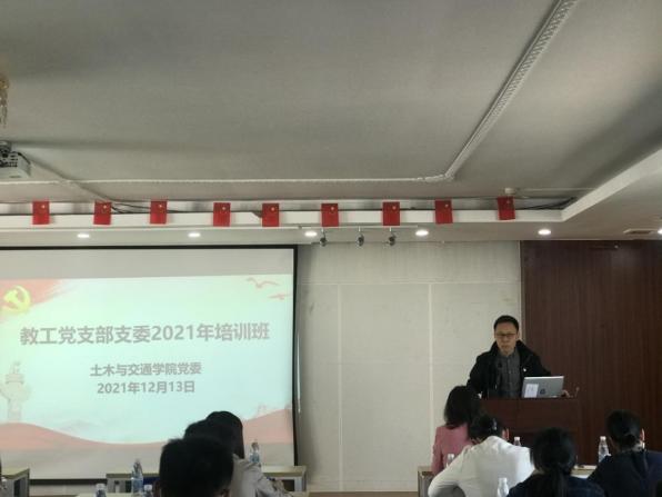 为深入学习贯彻党的十九届六中全会精神,推动党史学习教育走深走实,学习贯彻《中国共产党普通高等学校基层组织工作条例》,促进基层党建更上台阶,学院党委于2021年12月13日下午在交通大楼604会议室举办了2021年教工支委培训班。培训班由王磊副书记主持,教工党支部支委32人参加。