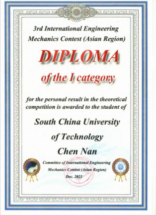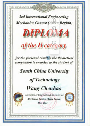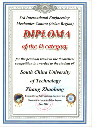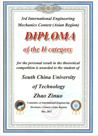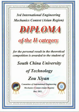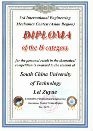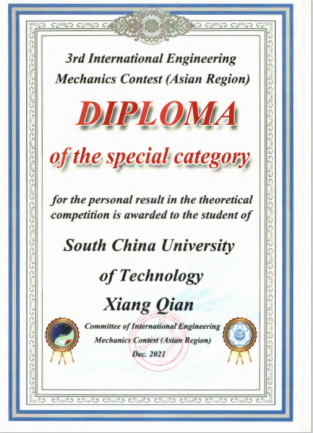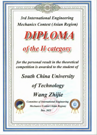 第三届国际大学生工程力学竞赛(亚洲赛区)由国际大学生工程力学竞赛组委会授权,河海大学和江苏省力学协会共同承办,于2021年12月11日在线上举办。本次竞赛共有67所高校(包括来自国外的3所高校)的697位学生参赛。华南理工大学土木与交通学院力学党支部高度重视,带头组织师生,通过选拔确定12名学生(19力创4名、20力创8名)组成参赛队伍,由支部副书记杨海兵及青年党员容亮湾两位老师带队出征此次竞赛。经过激烈角逐,华工学子斩获佳绩:1人获得全国特等奖(向前,20力创)、3人获得全国一等奖(马翀、翟乔阳、陈楠,20力创)、7人获得全国二等奖(张兆龙、汪郅杰、王晨浩、邹希言,19力创;雷祖粤、赵子诺、胡富耀,20力创),如图1。此外,由各参赛队伍前三名个人成绩总和进行排名,决出团体奖项。华工代表队获得本届(亚洲区)赛事团体二等奖(此奖项排名第一),指导老师杨海兵和容亮湾获得优秀指导教师荣誉,如图2。
