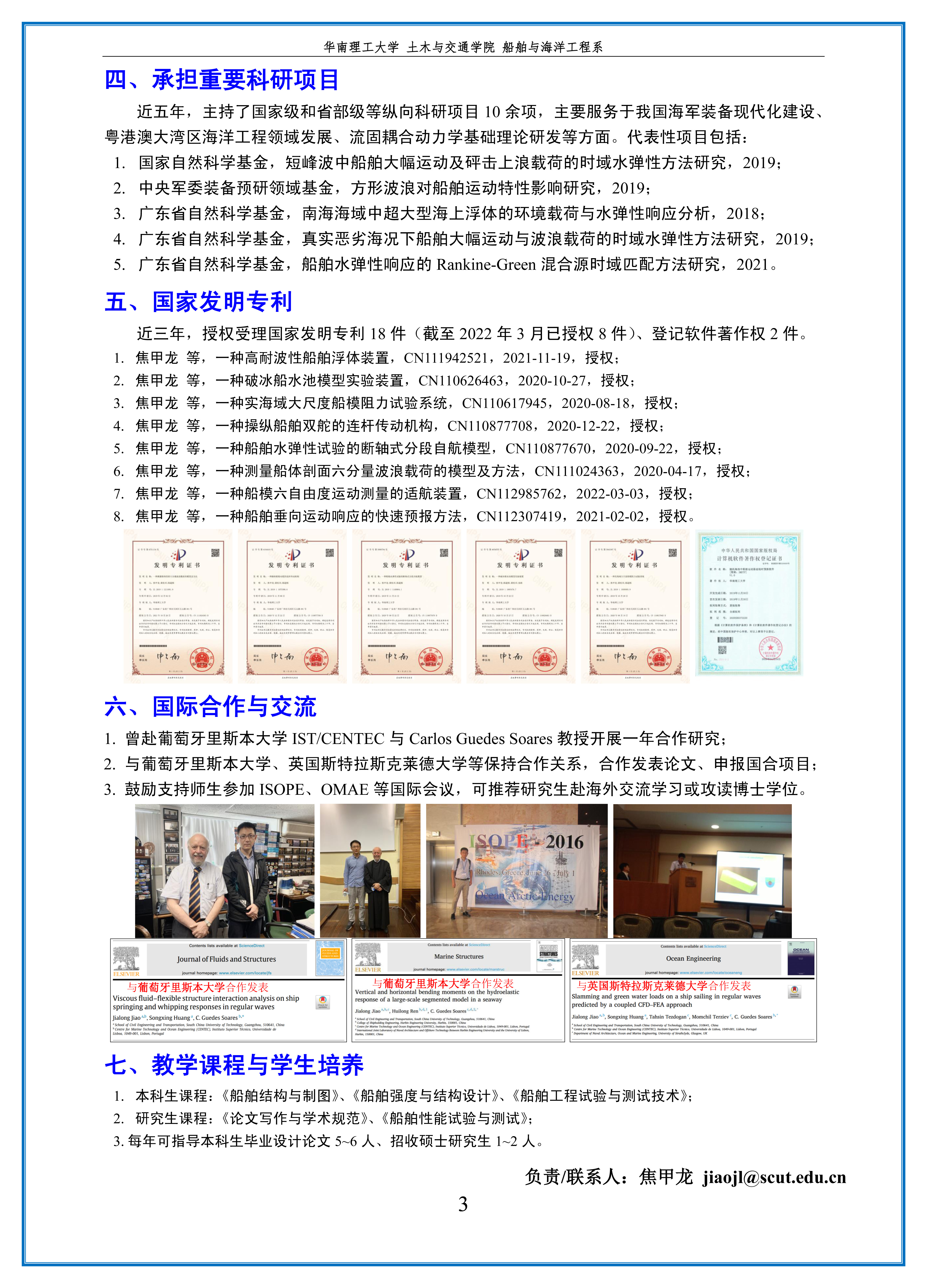 2021.09 ~ 今 华南理工大学 船舶与海洋工程 副教授,硕士生导师;