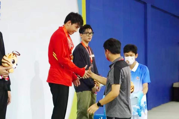 在男子甲组4X50米自由泳接力决赛中,陈梓涵最后一棒出场,与队友通力配合、劈波斩浪、“泳”往直前,最后以1分42.00秒的绝对优势成绩夺冠,并打破省大运会项目记录。在50米自由泳、50米蝶泳决赛中,陈梓涵分别以24.49秒、26.67秒的成绩夺得项目金牌。