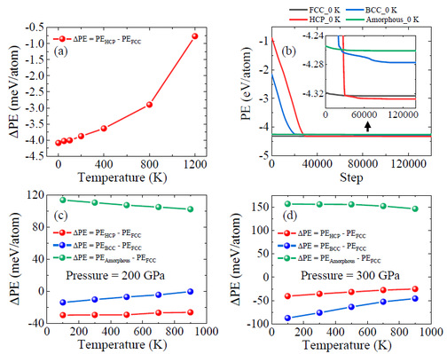 图6.(a)不同温度下随机原子模型FCC相与HCP相的势能差;(b)不同相在能量最小化过程中的势能演化;(c)-(d)高压下不同结构与FCC相的势能差随温度的变化关系。