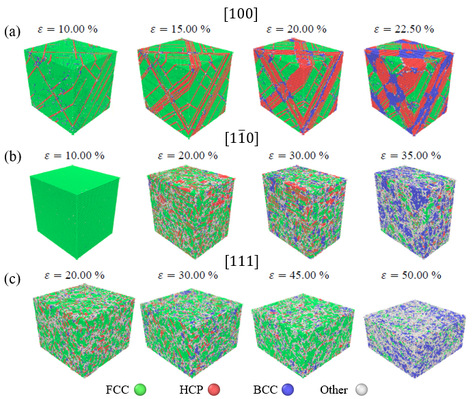 对比沿不同晶向加载的塑性变形与相变过程表明,沿[100]方向加载产生的层错堆叠引起材料发生面心立方结构(FCC)-密排六方结构(HCP)相变。在此基础上,带状HCP相的相互作用进一步诱导材料发生HCP-BCC相变(图4(a))。相反,沿[11 ̅0]和[111]方向的塑性变形仍以位错滑移为主导,当材料发生大变形且局部出现大量位错累积和相互作用时,晶体结构可转变为固态非晶结构(图4(b)-(c))。随着应变率的进一步增加,固态非晶化相变可发展成为塑性变形的主导机制(图5)。