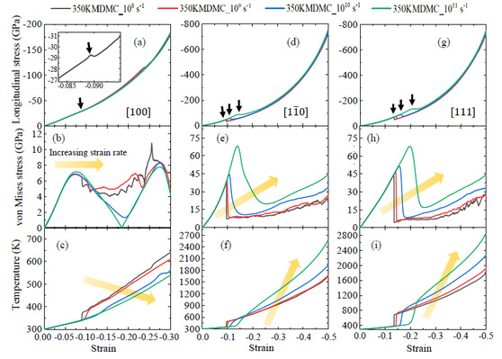 图2.不同加载晶向([100],[11 ̅0]和[111])在不同应变率(10^8 s^(-1)—10^11 s^(-1))压缩过程中的应力变化与温升。