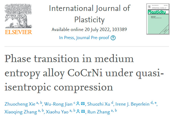 基于上述问题,华南理工大学姚小虎教授课题组与美国加州大学圣芭芭拉分校Irene J. Beyerlein教授课题组及斯坦福大学简武荣博士开展合作,通过大规模原子模拟方法对多主元合金塑性变形的各向异性与应变率敏感性以及多重相变路径的竞争关系进行研究。相关成果以“Phase transition in medium entropy alloy CoCrNi under quasi-isentropic compression” 为题发表在固体力学顶刊International Journal of Plasticity上。华南理工大学博士生谢卓成为第一作者,合作作者还包括加州大学圣芭芭拉分校Shuozhi Xu博士以及华南理工大学张晓晴、张闰教授。