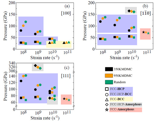 导读:本文利用大规模分子动力学模拟,通过准等熵压缩加载对CoCrNi多主元合金的相变路径展开系统研究。研究表明,多主元合金的相变行为与加载晶向、应变率、压力以及内部化学短程序结构等因素密切相关。其中,沿[100]晶向加载,化学短程序在变形初期诱导产生的异常体心立方(BCC)团簇结构使得材料的初始塑性行为与应变率无关。而沿[11 ̅0]和[111] 晶向加载的结果则表明高应变率可诱导材料发生固态非晶化转变。多重相变路径的存在与相互竞争不仅凸显出多主元合金的多态性,同时也为满足极端服役环境的材料性能提升提供了新的调控思路。