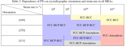 沿不同晶向([100],[11 ̅0]和[111])的加载结果显示,多主元合金[100]方向的屈服行为表现出应变率无关性,而[11 ̅0]和[111]方向的屈服强度则与应变率呈正相关关系(图2)。此外,沿 [11 ̅0]和[111]方向加载的温升比[100]方向更加显著。以上结果均表明材料的塑性变形具有显著的各向异性。