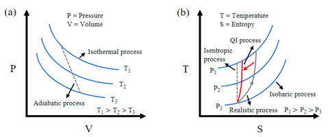 图1.不同热力学路径对应的(a)压力-体积关系和(b)温度-熵值关系。
