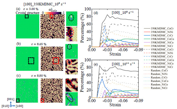 图3. (a)-(c)沿 [100]加载,材料变形初期的晶体结构和化学短程序分布;(d)-(e)不同应变率下,材料变形初期BCC团簇中的不同原子对占比。