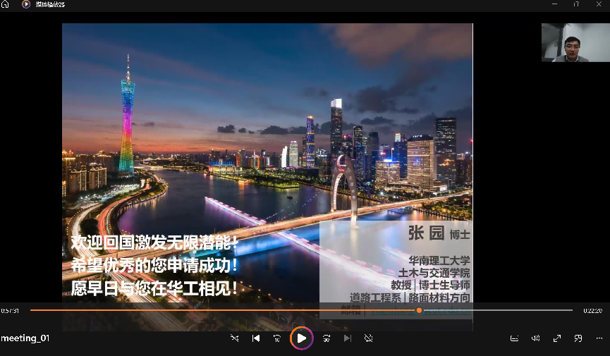 道路工程系主任张园教授作为学院近年海外归国青年人才代表,从“选择回国初心、海优申请准备、入职华工优势”三个方面生动详实地分享了自身发展经历。他希望能和各位学者心怀家国、开拓进取、激发潜能、挑战自我,共同为国家、粤港澳大湾区建设发展贡献力量。