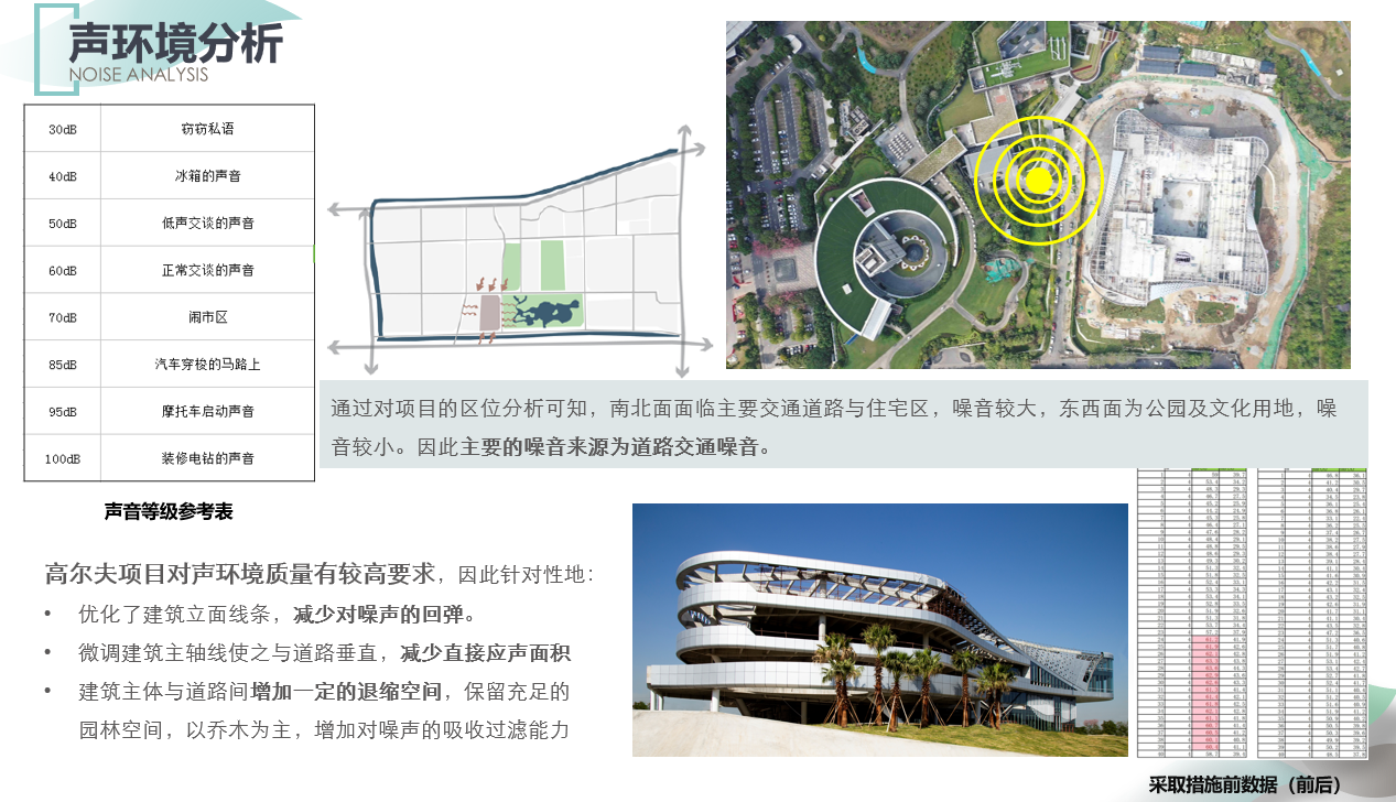 本项目在方案阶级,即针对高尔夫运动的需求,通过 BIM 绿建性能分析,对设计方案进行噪声环境、风环境、日照、小空间微气候等性能化分析;获取科学直观的分析数据,结合安养项目对声、风、光环境的高品质需求,对总平面图布局、结构形式、平面布局、园建造景布置,绿化植物梯度布置等关键点进行了针对性优化。同时 BIM 全专业模型即时同步,提供直观的三维可视化环境,辅助外立面视觉效果、屋面机电设备布置、适老化灯光配置及灯光质量,提升设计沟通决策效率。