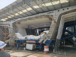 “约260米高的塔身,每一个横截面都不相同,打造这样的钢筋混凝土异形索塔是巨大的挑战,在行业内也是极其罕见的,建造难度可想而知。” 曾俊杰副经理表示,该项目在塔柱施工过程中采用的先进DOKA爬模技术,其模板采用造型木设计,通过调节造型木尺寸,每次切割造型木5-6毫米,改变模板形状来实现索塔纤腰形设计的外形要求。同时,桥塔采用的预制部品钢筋整体吊装工艺,可大大减少高空作业风险,相比人工散绑钢筋,可将主塔钢筋施工效率提升4倍,同时使安装精度和质量明显提升。