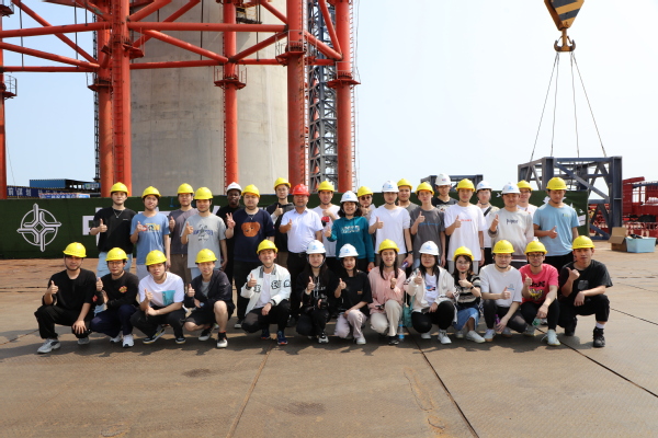 高栏港大桥和黄茅海大桥两座大桥共5座主塔高度达250-260米,采取塔柱底部和顶部粗、中间细的设计,形如“小蛮腰”。在浩瀚的黄茅海海域上,一条横跨珠海与江门的“跨海巨龙”骨架愈加丰满,施工现场塔吊林立。同学们站在施工便桥仰望,“海上小蛮腰”高栏港大桥主塔犹如一根“定海神针”,高耸入云,尽显通天之势。