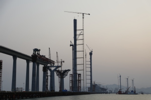 “东边2座主塔,西边3座主塔,中间TY型桥墩作引桥接驳。”技术部沈大为经理介绍到,黄茅海海域将架设2座跨越3条航道的特大桥——高栏港大桥和黄茅海大桥,两桥是黄茅海跨海通道项目的控制性节点。其中,高栏港大桥有东西2座主塔,黄茅海大桥由东塔、中塔、西塔3座主塔作为支撑,5座主塔高度均接近260米。其中,高栏港大桥采用钢箱梁双塔单跨斜拉桥设计,跨径700米;黄茅海大桥拟采用钢箱梁三塔双跨斜拉桥设计,跨径720米,建成后将成为世界跨径最大的三塔斜拉公路桥。