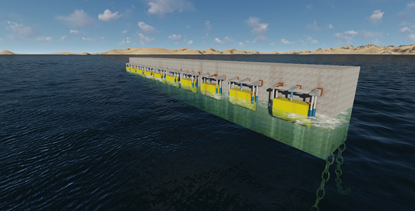 多浮体发电装置与浮式防波堤结合的集成系统,利用了防波堤的聚波特性,提高其迎浪面处波浪能量,使得波能浮子能量转换性能提升。同时,波能浮子吸收波浪能可减轻波浪对防波堤冲击。本作品实现了浮子吸能效率的增加以及防波堤防波性能的提升,从而到达了防波聚能,双效合一的效果。
