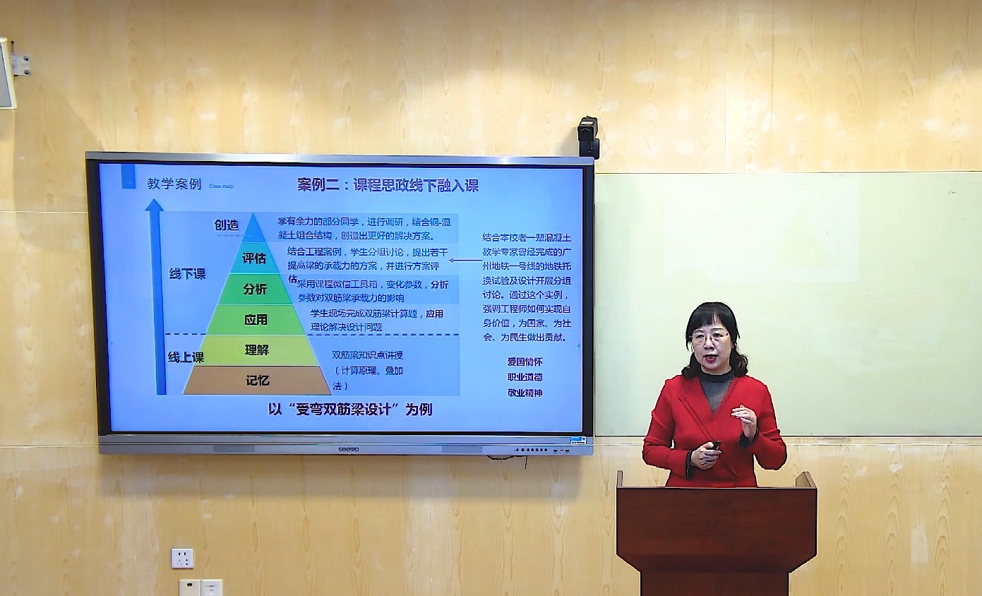 季静教授的《混凝土结构理论》课程通过三个课程思政典型案例:思政第一课、思政课堂一节课、线上思政讨论环节,展示了课程思政教育的有机融入,培养学生精益求精的大国工匠精神和职业道德;陈庆军教授的《“化整为零、聚沙成塔”——土木工程课程思政教育浅谈》分享了如何将思政教育分解为若干要点,无痕融入到所讲授的三门课程中去,并讲解了与学生共建思政资源的创新做法。张海燕教授分享了杨易教授和她在《建设法规》授课过程中的思政融入点和融入方法,通过结合工程实际和日常生活,以“讲故事”的形式将一个个小的思政元素融入到每章节的专业知识学习中,充分彰显出我国工程建设领域的“硬实力”和法治建设领域的“软实力”。