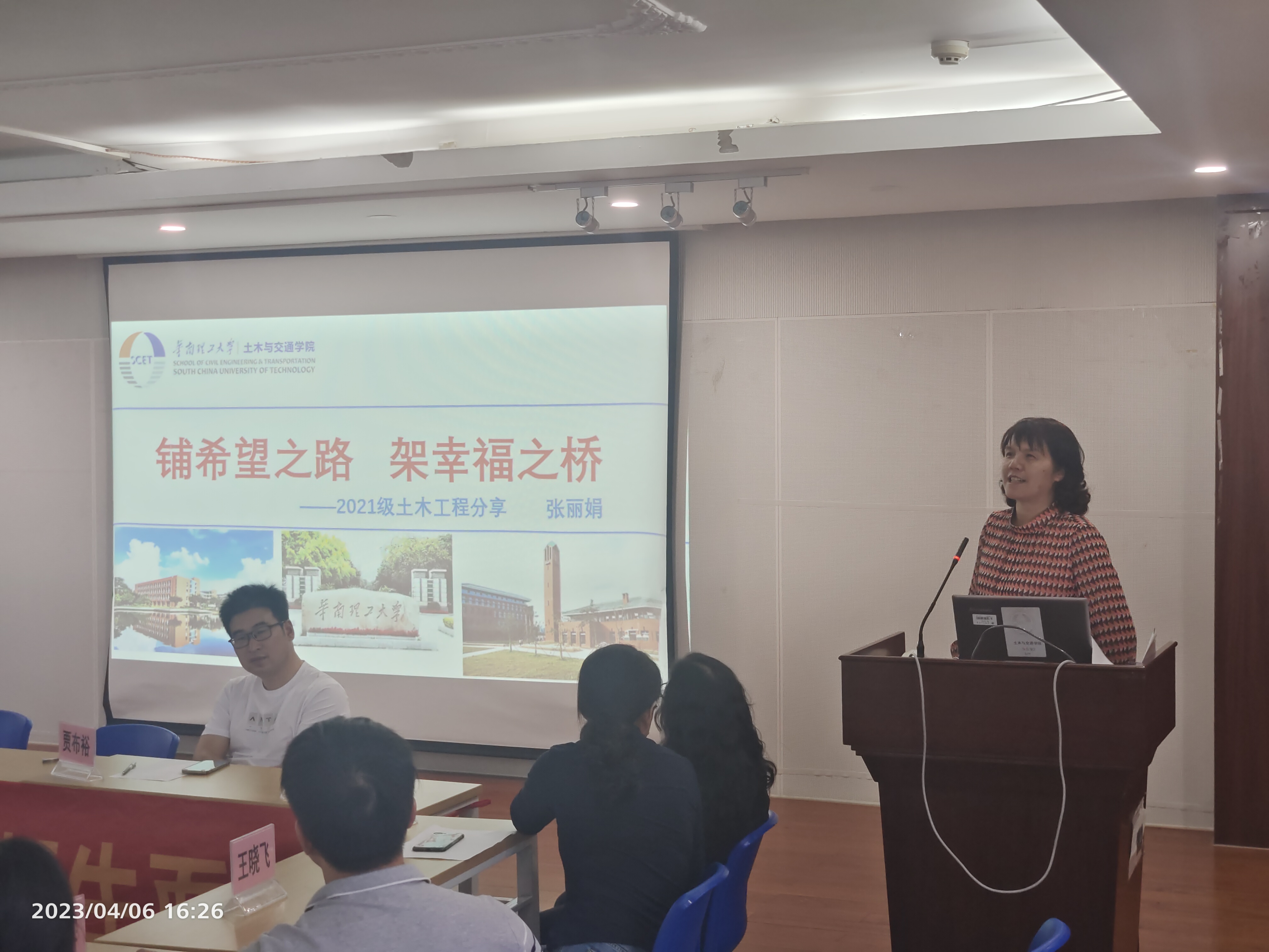 交流会在道桥党支部副书记余晓琳的欢迎致辞中拉开帷幕。余晓琳老师先向同学们简单介绍了国家和区域交通发展规划战略、展示了道桥方向的师资情况,并以港珠澳大桥、深中通道和海心桥等工程为例,展现了重大工程中的华工力量。
