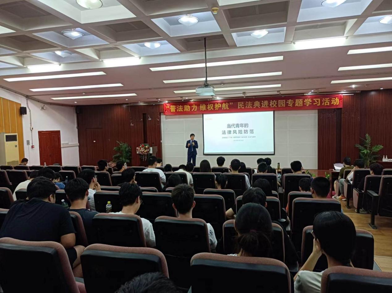 我校校友、上海兰迪律师事务所高级合伙人、执行主任孔云飞律师作了题为《当代青年的法律风险防范》的专题报告。报告中,他回顾了我国法治体系的建设历程,阐明了习近平法治思想的重要意义。习近平法治思想深刻回答了新时代为什么实行全面依法治国、怎样实行全面依法治国等一系列重大问题,是顺应实现中华民族伟大复兴时代要求应运而生的重大理论创新成果,是马克思主义法治理论中国化最新成果,是习近平新时代中国特色社会主义思想的重要组成部分,是全面依法治国的根本遵循和行动指南。而《中华人民共和国民法典》则是保护人民群众自身权益的“社会生活百科全书”式法典,涵盖了物权、合同、人格权、婚姻家庭、继承、侵权责任。“读典学法”,将进一步增强同学们的法治观念,营造浓厚的学法氛围,为共同维护社会平安和谐,共筑美好生活筑牢了一道法治防护墙。孔律师结合电信诈骗、消费陷阱、兼职欺诈、就业风险、学业风险等类型的案例,深入浅出地分析了当代青年容易遭遇的各类陷阱和面临的法律风险,并提出了维权途径建议。