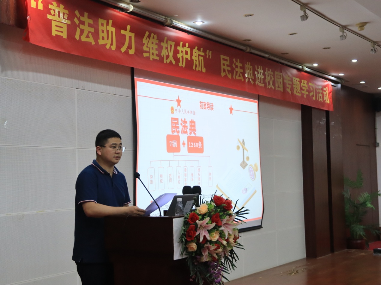 活动伊始,学院青年教师发展委员会委员、土木工程系青年教师代表宋丹青首先介绍《中华人民共和国民法典》的编纂历程和重大意义,民法典共7编、1260条,系统地整合了新中国70多年来长期实践形成的民事法律规范、汲取了中华民族5000多年优秀法律文化,借鉴了人类法治文明建设有益成果,是一部体现我国社会主义性质、符合人民利益和愿望、顺应时代发展要求的法典,是一部体现对生命健康、财产安全、交易便利、生活幸福、人格尊严等各方面权利平等保护的法典,具有鲜明中国特色、实践特色、时代特色。