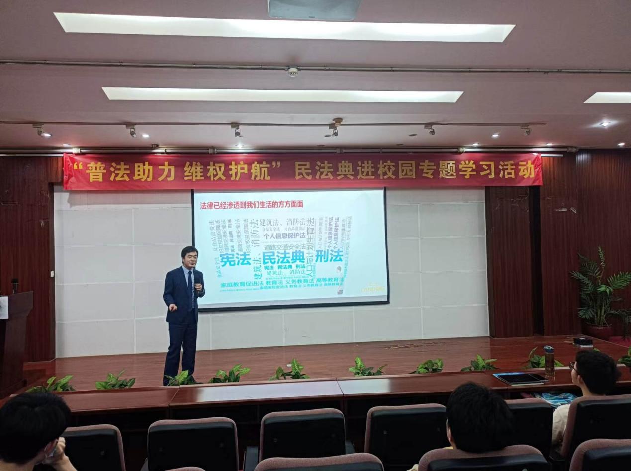 今年5月是我国第三个“民法典宣传月”。结合主题教育总体要求,深入学习宣传贯彻习近平法治思想,引导广大团员青年坚定不移地走中国特色社会主义法治道路,建设中国特色社会主义法治体系、全面推进中国特色社会主义法治国家建设,5月18日,土木与交通学院在交通大楼学术报告厅举办了“普法助力,维权护航”民法典进校园主题团日活动。学院青年教师代表、各团支部团员代表,学院团委、学生会部门代表共120余人参与了学习。
