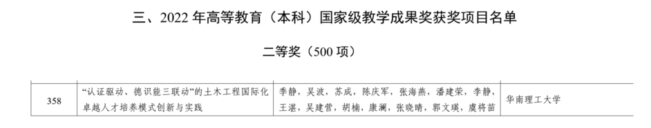 2023年7月24日,教育部网站正式发布关于批准2022年国家级教学成果奖获奖项目的决定,由华南理工大学土木与交通学院季静教授作为第一完成人,吴波、苏成、陈庆军、张海燕、潘建荣、李静、王湛、吴建营、胡楠、康澜、张晓晴、郭文瑛、虞将苗13位我院教师为成员完成的《“认证驱动、德识能三联动”的土木工程国际化卓越人才培养模式创新与实践》项目,获得高等教育(本科)国家级教学成果二等奖。