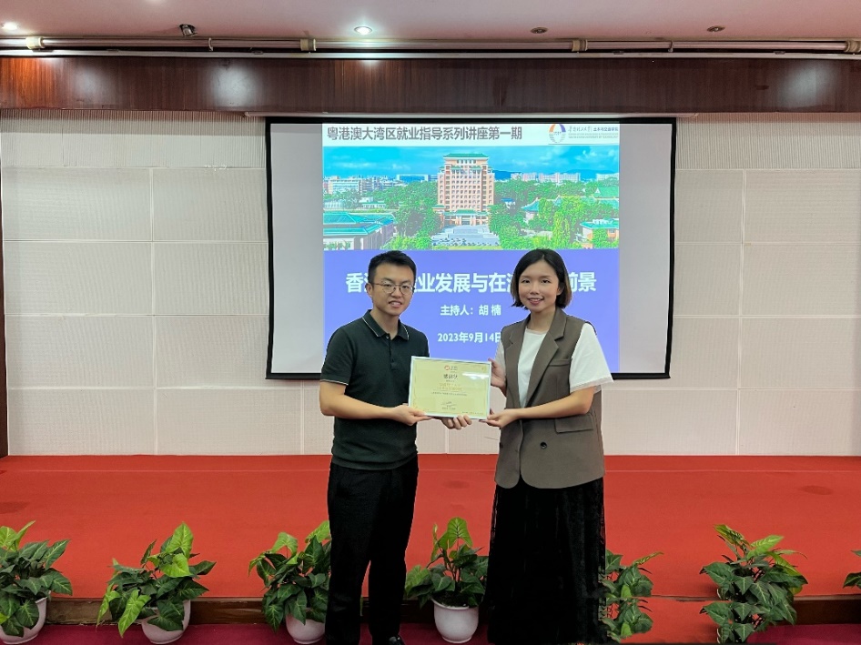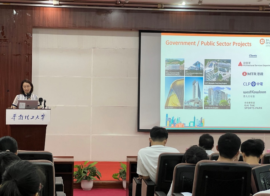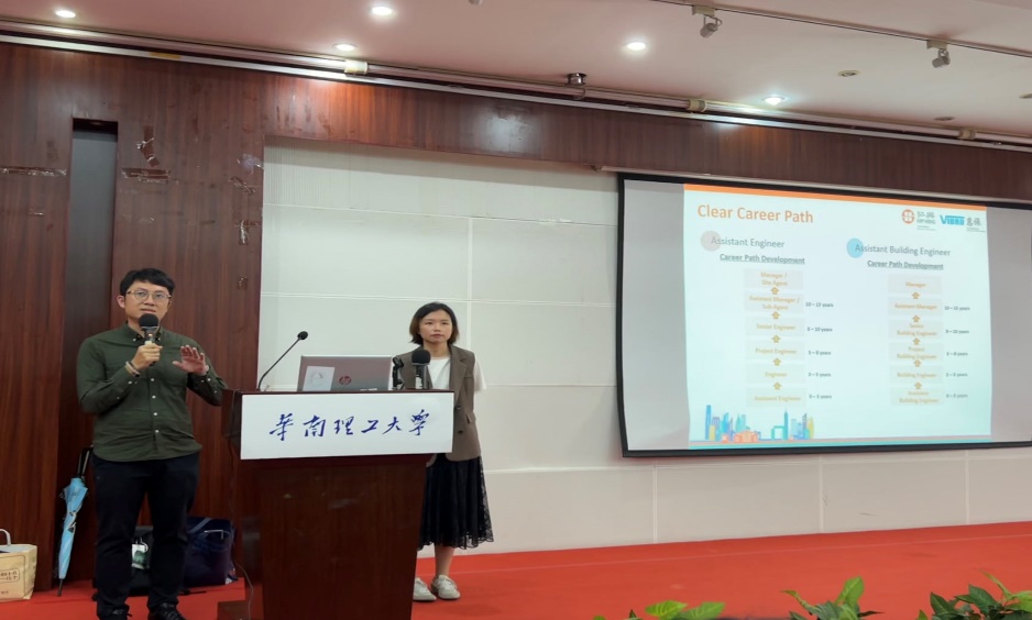 随后,协兴建筑有限公司深圳公司办公室主任赵红霞介绍了香港建造业发展、协兴公司的基本概况、发展方向和企业文化;建筑工程助理经理黄柏坚分享了在港工作的个人经历和工作内容以及提出了职业发展规划的建议;人力资源经理王嘉琪就招聘岗位、培养计划、薪酬待遇和在港就业优势等问题进行了详细解读,表达了对内地人才招募的重视和展示出强大的保障体系,以及对多元文化背景的包容,以此希望内地学生把握香港建造业发展的历史机遇,到港发展,为香港建造业带来新的活力。