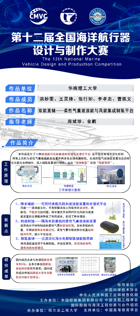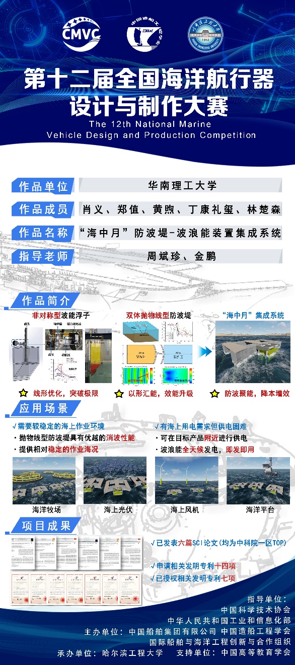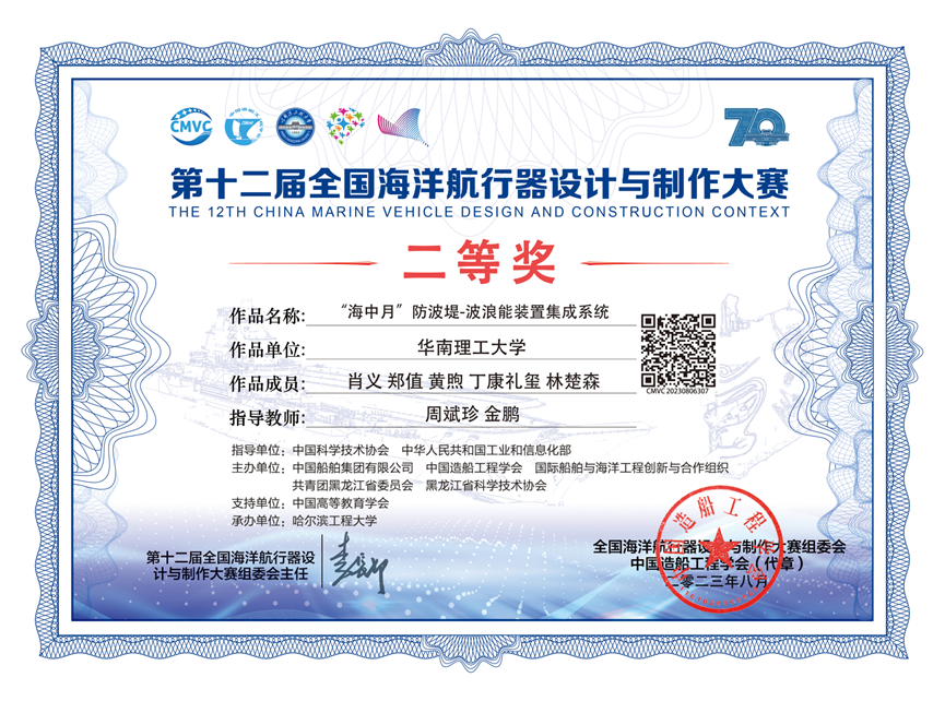 8月12日-13日,由中国科学技术协会、工业和信息化部指导,并由中国船舶集团有限公司、中国造船工程学会、国际船舶与海洋工程创新与合作组织、共青团黑龙江省委员会和黑龙江省科学技术协会主办,哈尔滨工程大学承办的第十二届全国海洋航行器设计与制作大赛在哈尔滨工程大学拉开帷幕,来自北京大学、上海交通大学、哈尔滨工程大学等不同学校、科研院所的共117家单位,1066支队伍,4341名师生入围国赛。经过华南区域赛的评审和推荐,我院“‘海中月’防波堤-波浪能装置集成系统”团队、“双能直储-柔性气囊波浪能与风能集成制氢平台”团队进入国赛。最终“‘海中月’防波堤-波浪能装置集成系统”团队(参赛学生肖义、郑值、黄煦、丁康礼玺、林楚森)荣获新概念创意设计A1赛道的二等奖。