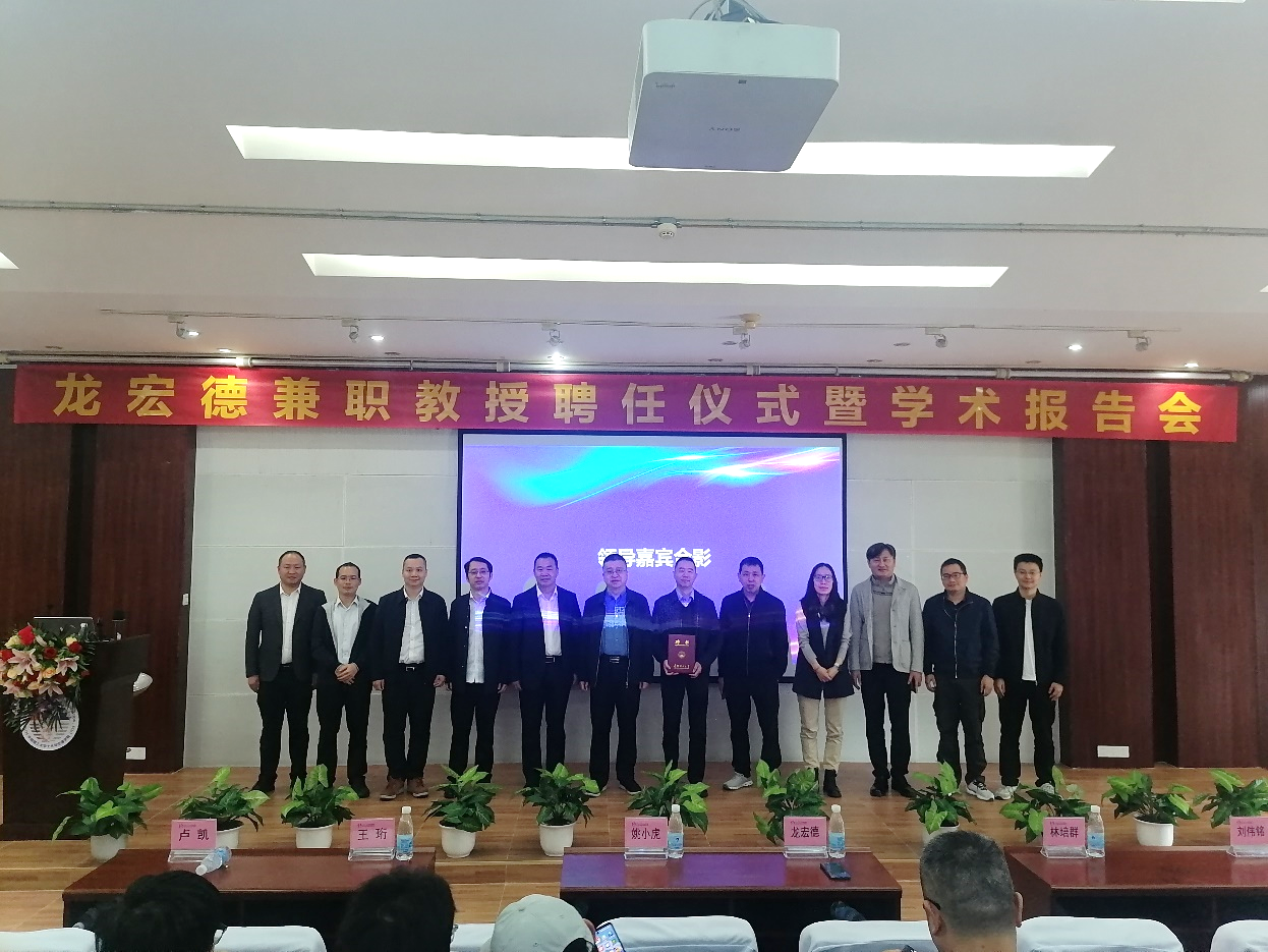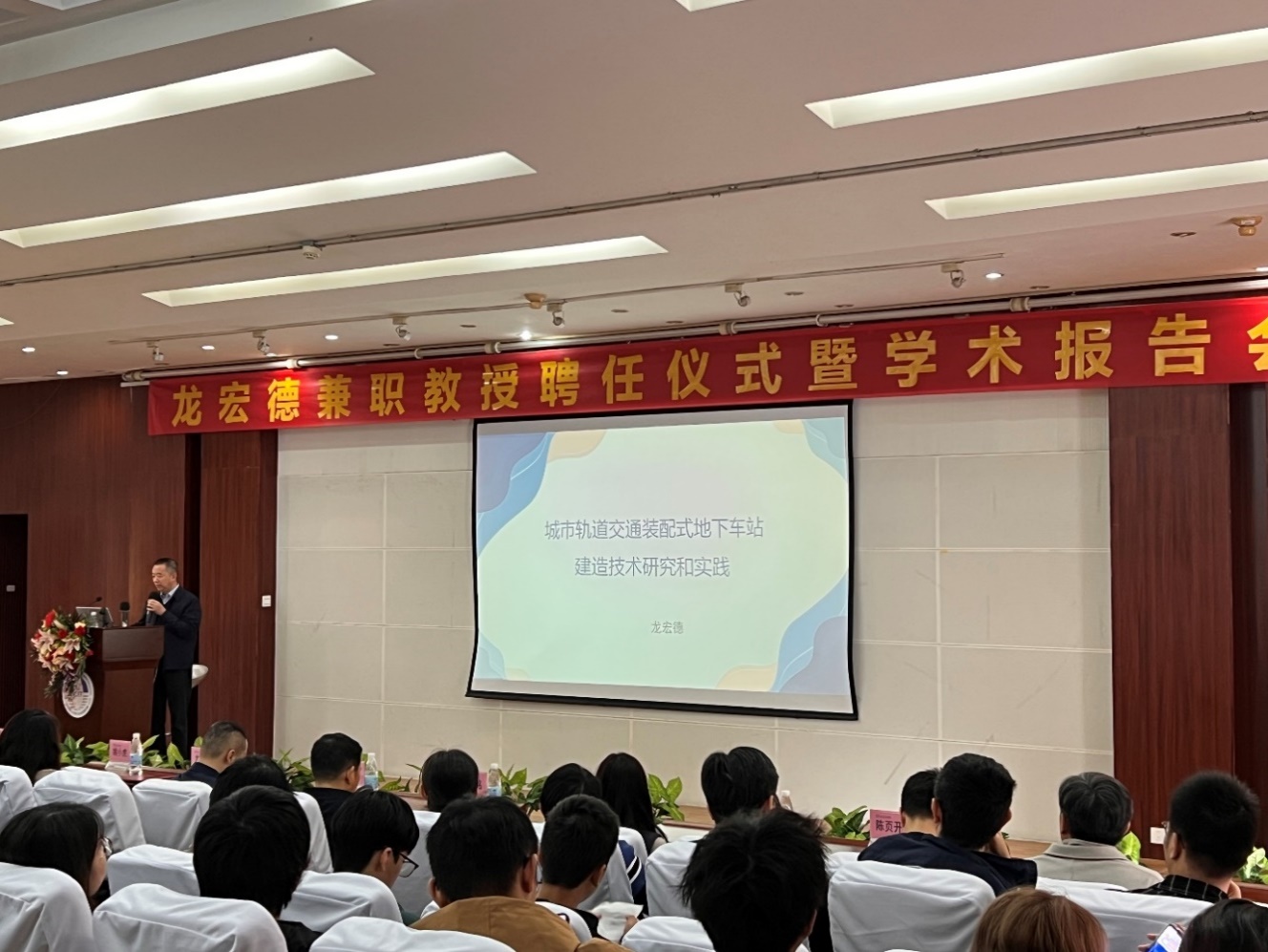 会上,姚小虎为龙宏德颁发华南理工大学兼职教授聘书。龙宏德以《城市轨道交通装配式地下车站建造技术研究和实践》为主题为师生们作了学术报告。