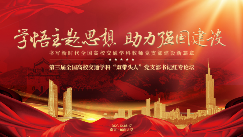 12月16-17日,第三届全国高校交通学科“双带头人”党支部书记红专论坛在东南大学举行。本次论坛主题为“学悟主题思想、助力强国建设,书写新时代全国高校交通学科教师党支部建设新篇章”,来自哈尔滨工业大学、同济大学、西南交通大学等全国近20所高校的交通学科“双带头人”教师党支部书记和党务工作人员共30余人参加会议。