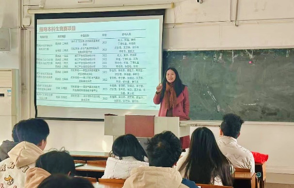 会议开始,党支部书记周斌珍教授向同学们介绍了交流会的目的,希望同学们能积极参与科创活动。她向同学们全面介绍了其课题组的人员组成、研究方向及科创活动的开展情况、参赛及获奖情况等。