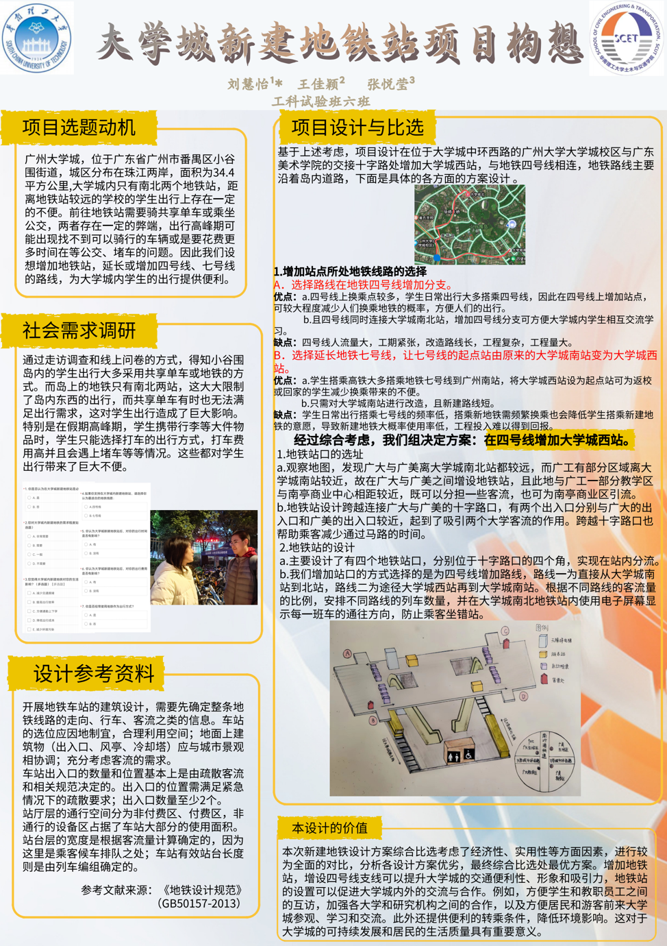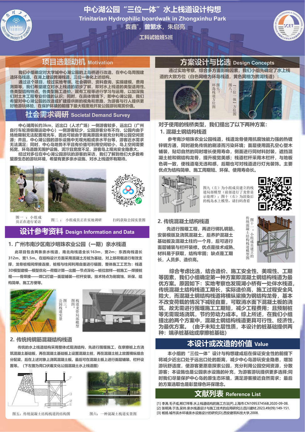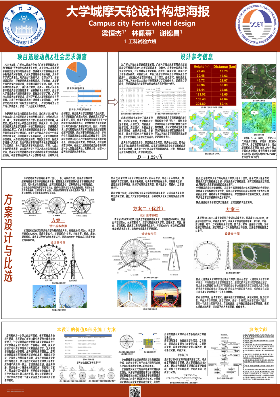 2023年12月28日上午,土木与交通学院在大学城校区A4教学楼中庭举办2023级“智慧土木与数字建造”工科试验班《土木工程概论》期末项目海报展活动。该课程由土木工程系胡楠、赵俊贤、陈太聪、潘卫东,水利工程系王兆礼,道路工程系张园和工程管理系邓逸川七位老师共同承担。以《大城·小构》为主题的期末项目海报展(以下简称“项目”)作为《土木工程概论》的课程考核方式是基于工程认证理念下,对课程持续改进的其中一环。246位同学三人一组,以广州大学城为背景,在岛内构想一座结构物的新建或改造。各小组开展社会调研,方案搜集,概念设计与比选等环节,最终以海报的形式呈现。