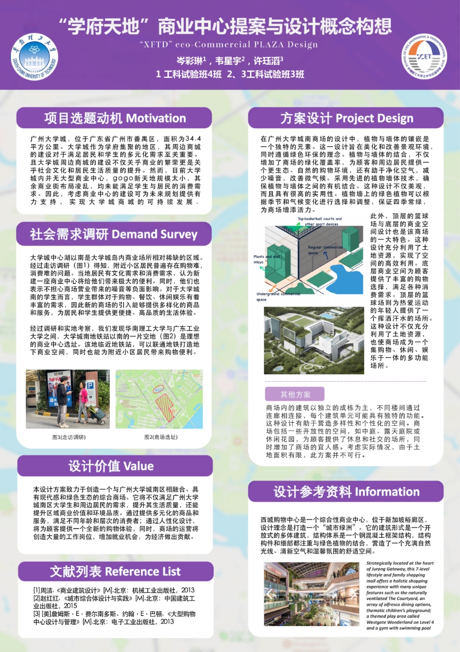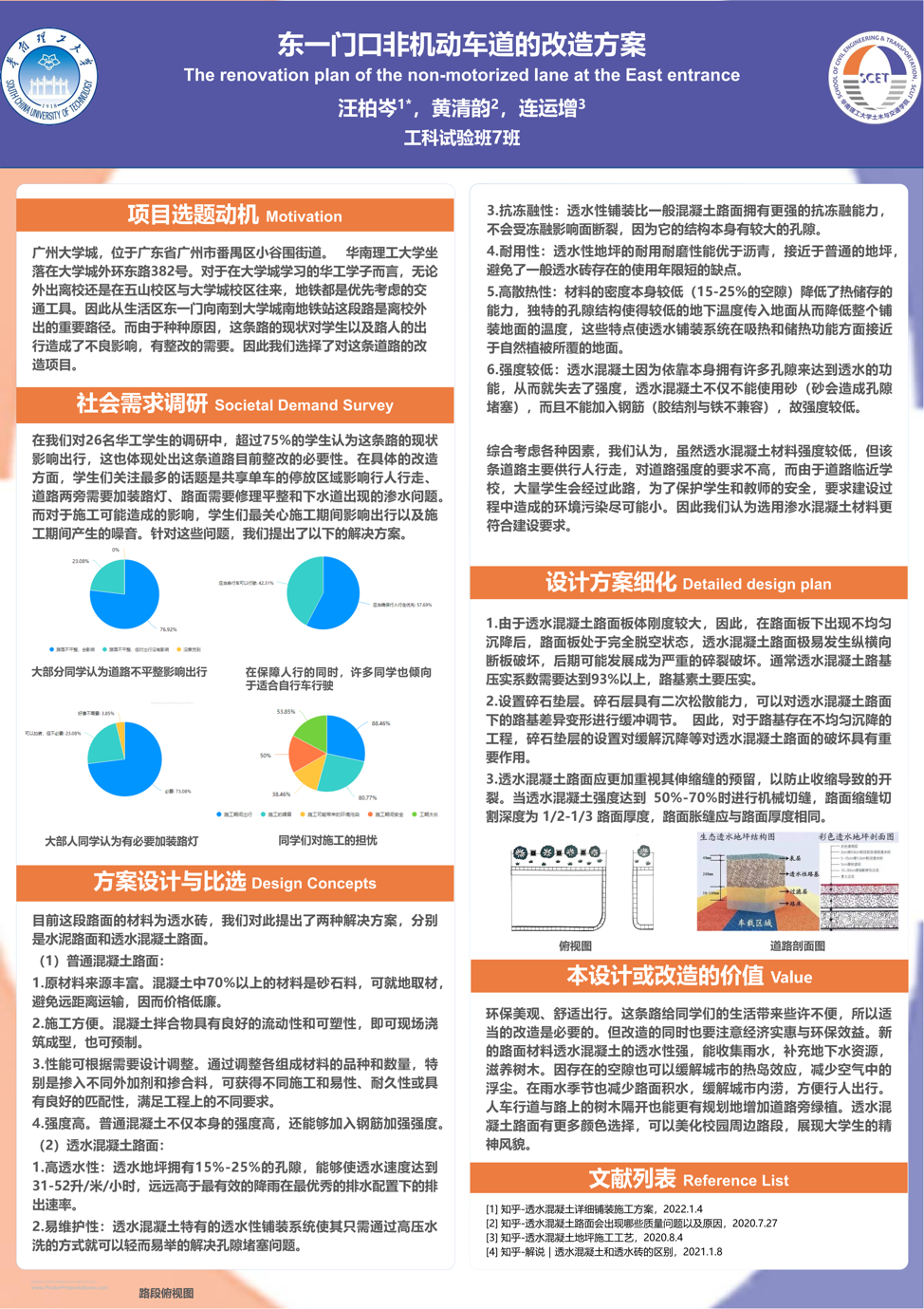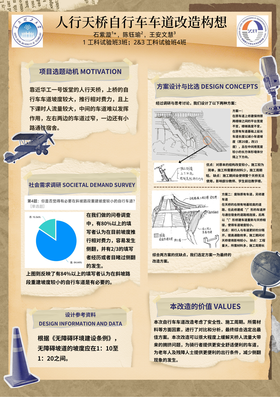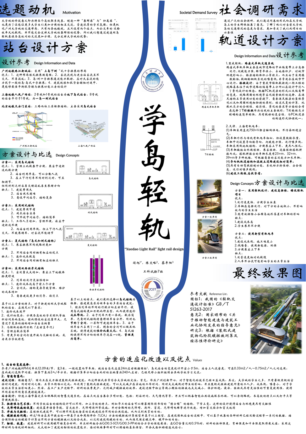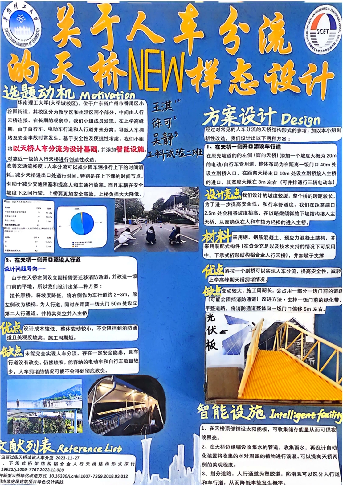 本次项目实施中,各小组根据兴趣,围绕交通基础设施、景观结构、人行天桥、公共及商业化建筑类、非机动车道、停车场和道路改造、校园及民用建筑七个主题,选定一座结构物进行设计或改造。针对选定的结构,每组同学都在大学城内开展了问卷采访或实地考察等不同形式的调研。基于课堂中所学的基本知识和概念,结合文献调研,提出不同的结构设计方案。本次项目鼓励大家利用新兴工具,很多小组大胆尝试了AI绘图,并针对各自的设计内容对通用AI软件进行调试,获得自己满意的效果。最终,每组需完成一个A1尺寸大小的海报,并在展览中向授课教师和其他组同学进行讲解和答辩。现场评分包括小组互评、教师打分和人气投票三个部分。整个过程持续了两个小时,同学们状态饱满,对自己的设计进行充分讲解和展示,反响强烈。
