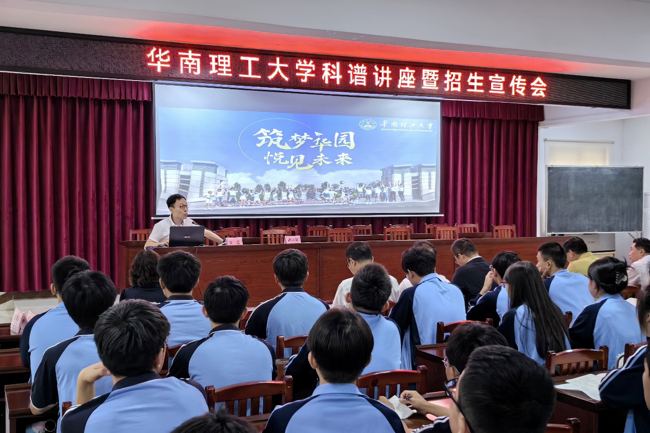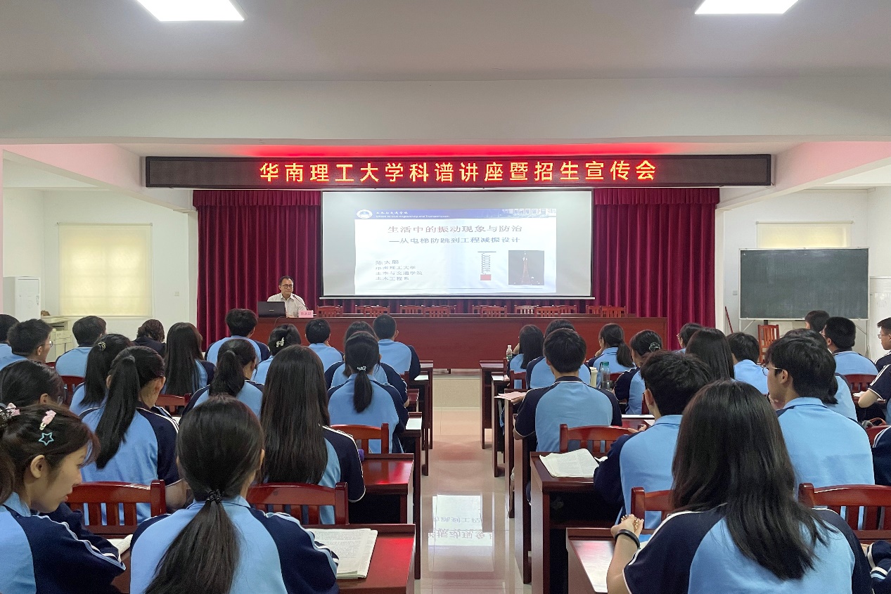 在揭西县河婆中学招生宣讲会上,王磊为中学生们介绍了华南理工大学历史沿革、专业概况以及高考招生政策。陈太聪为同学们作了题为《生活中的振动现象与防治——从电梯防跳到工程减振设计》的专业科普讲座。招生组还在现场设置招生咨询点,为学子们提供招生咨询服务。