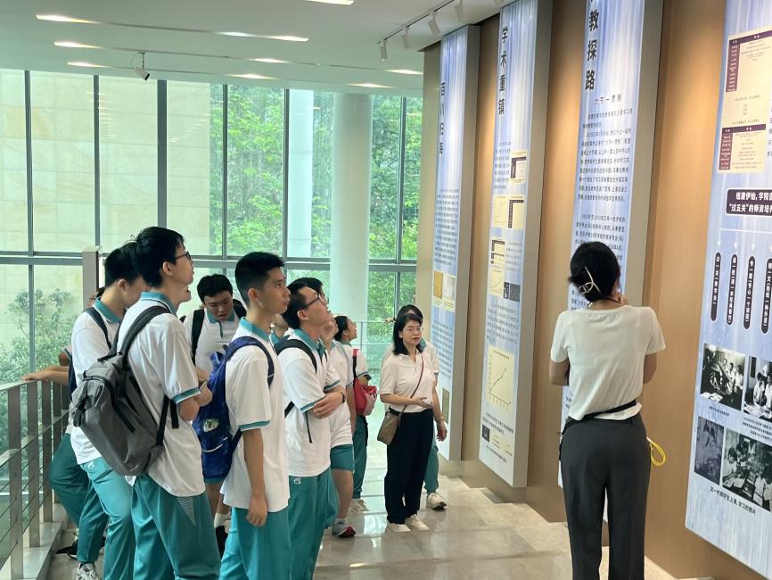 在华南理工大学初心校史馆,通过讲解员的介绍,同学们了解到华南理工大学的发展历程、建设成效,名师风采和教学科研成果,学生们深刻领略了学校的深厚历史与文化积淀的同时,也进一步增强了他们对华工的认同感。