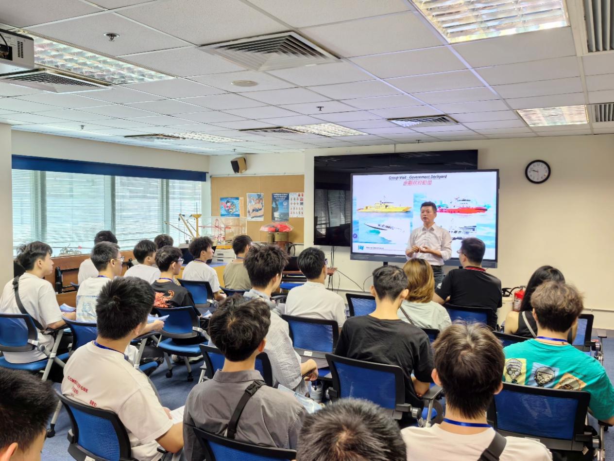 7 月9日上午,师生们前往政府船坞进行参观与座谈交流。在座谈会中,香港海事科技学会陈伟生主席以及政府船坞的工作人员热情地向同学们介绍了香港海事科技学会的相关内容,并且详细说明了随后参观政府船坞的注意事项。座谈会结束后,在陈主席及工作人员带领下,师生们进入模拟船舱,亲身体验了货船与海警船的驾驶操作。随后,师生们一行在工作人员的带领下,探访了政府船坞多个工作场地,同学们收获颇丰,对船坞工作有了更深入的认识。